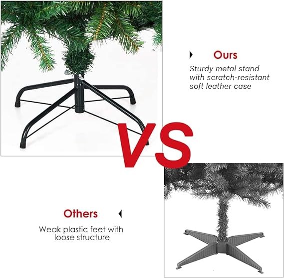 • ?Sturdy metal stand—Our christmas tree uses metal stand instead of cheap plastic stand to ensure tree stand stability .And the stand have scratch-resistant soft leather case to protect floor and legs.