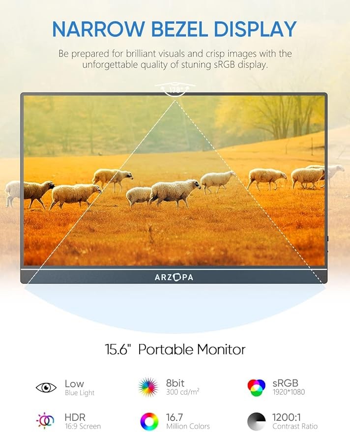ARZOPA Portable Monitor, 15.6 Inch 1080P FHD Laptop Monitor USB C HDMI Computer Display HDR Eye Care External Screen with Smart Cover for PC Mac Phone Xbox Switch PS5-S1 Table