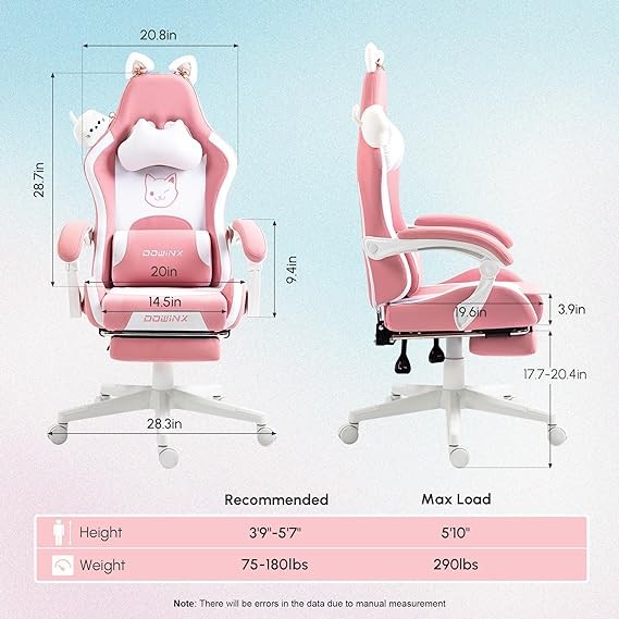 • Next Level Cuteness: What truly sets this gaming chair apart are the endearing cat ears perched on the top corners of the chair's backrest, cat-shaped headrest and cat doll. These whimsical accents add a delightful touch of playfulness and create an instant connection with anyone who lays eyes upon them. The cat ears and doll are removable and can be replaced with your favorite decorations.