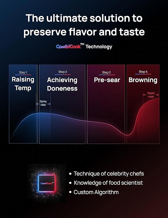 • Bring world-class cooking to your kitchen : CombiCook translates the techniques of chefs into a smart algorithm that lets ChefMaker control all the cooking through its precise cook probe, water atomization and super convection heating systems. Unlike traditional cookers, ChefMaker automatically divides the cooking process into steps, resulting in a perfect balance of doneness, browning, juiciness, and aroma.