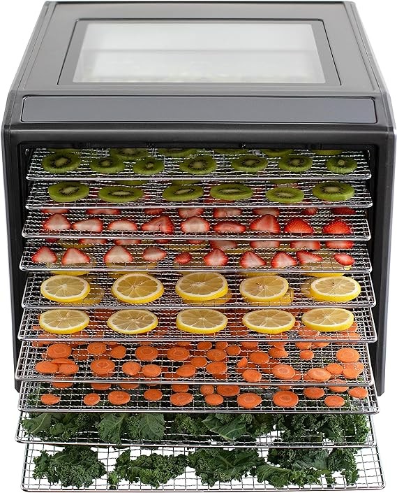 • LARGE CAPACITY: With 16 sq. ft. of drying space and 10 stainless steel-plated trays, this dehydrator provides ample room to dehydrate large batches of food items simultaneously, saving you time and effort.