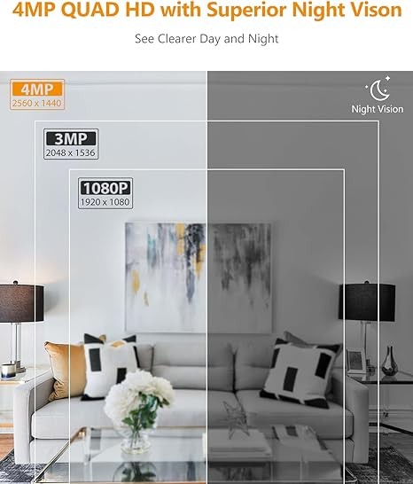SEE EVERYTHING CLEARER DAY AND NIGHT: (2560×1440) 4MP Quad HD live monitoring with 33 ft superior night vision provides highly detailed clarity, even in complete darkness. 0-355° horizontal and 0-90° vertical rotation enables a complete 360-degree view