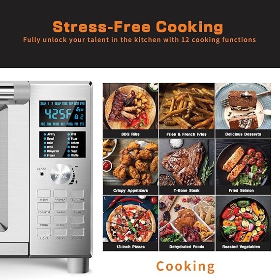 • ULTRA-LARGE CAPACITY: 2-layer even cooking, The oven’s 30QT capacity 1 layer fits up to 6 slices of bread, a 13-inch pizza, or a 10lbs whole chicken. Fully meet family needs