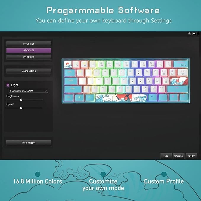 • 【Theme Style 60% Keyboard】: The theme style makes this 60% keyboard more unique. The matte translucent bottom cover will give your keyboard an incredibly smooth and clean feeling when RGB is turned off. When RGB is turned on, the frosted wall brings out the brilliance of RGB in all directions.