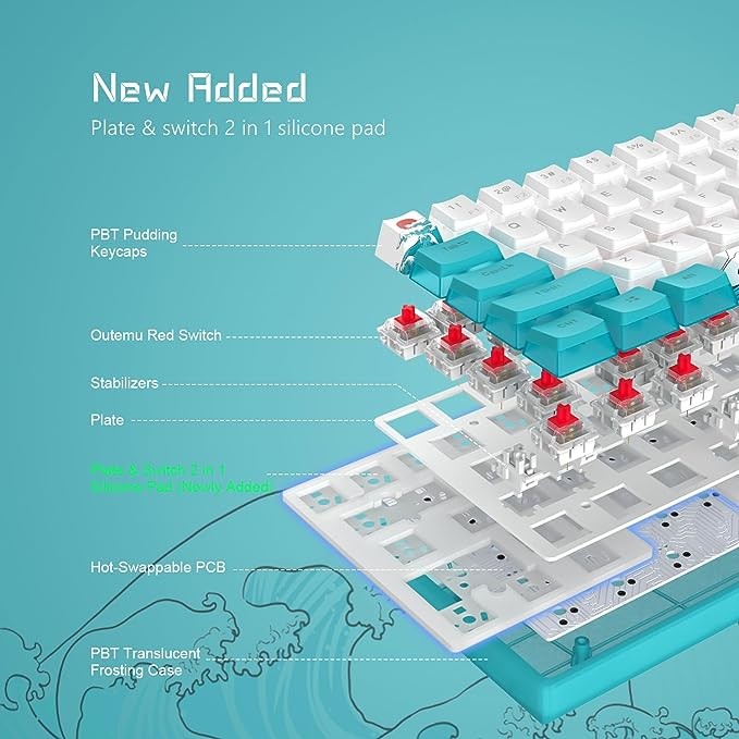 • 【 Plate & Switch 2 in 1 Silicone Pad (Newly Added) 】The gaming keyboard has added the latest 2in1 Silicone Pad, which provides a richer operating space for keyboard DIY enthusiasts. Pad can maximally absorb hollow sound and provide extra stable typing feeling.